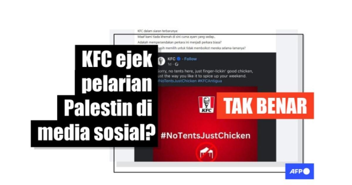 "KFC dalam siaran terbarunya: Maaf kami tiada khemah di sini cuma ayam yang sedap," bunyi kapsyen catatan yang dikongsi di Facebook pada 19 Februari 2024. "Adakah mempersendakan perkara ini menjadi perkara biasa?"
