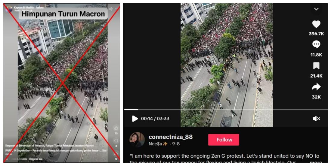 Ratusan ribu orang berdemonstrasi di seluruh Perancis menentang pemotongan bajet yang bakal dilaksanakan oleh kerajaan Perancis yang dipimpin oleh Presiden Emmanuel Macron. Namun video yang disiarkan di media sosial dengan dakwaan ia menunjukkan protes tersebut sebenarnya dirakam di Nepal.