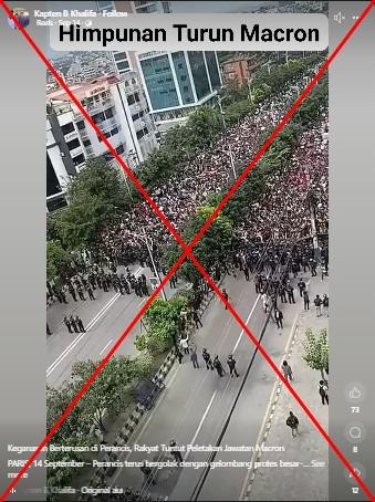 "Keganasan Berterusan di Perancis, Rakyat Tuntut Peletakan Jawatan Macron," bunyi siaran Facebook pada 14 September 2025.
