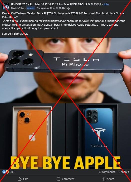 “Kemas Kini Terbaru! Telefon Tesla Pi $789 Akhirnya Ada STARLINK Percuma! Elon Musk Kata "Apple Patut Risau!" bunyi sebahagian hantaran di Facebook pada 22 September 2025.