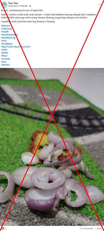 "Salah 1 solution untuk anak-anak demam n tidak sihat.letakkan bawang ditapak kaki n pakaikan stokin," tulis sebahagian kapsyen pada siaran Facebook dikongsi pada 21 Oktober 2025.