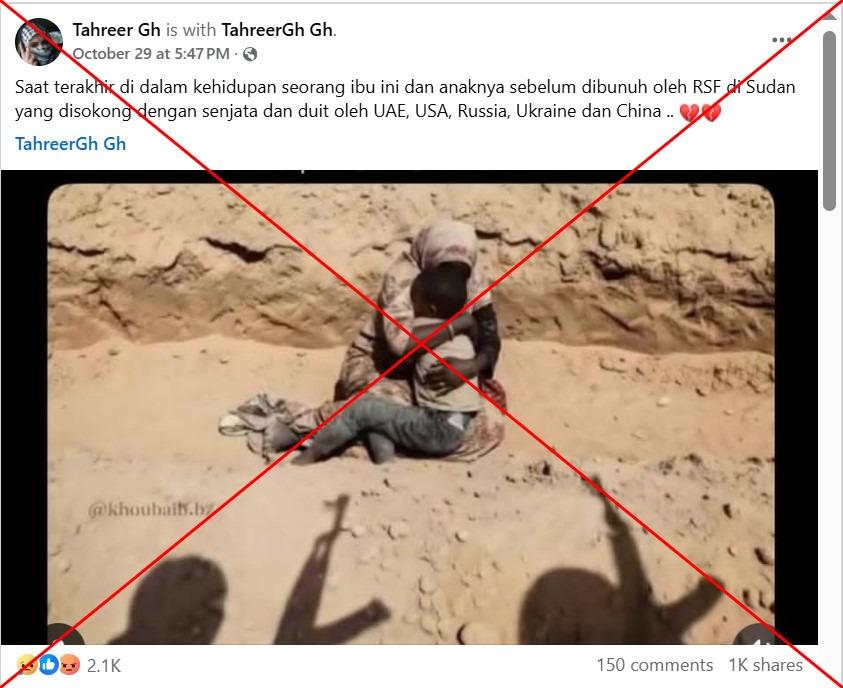 "Saat terakhir di dalam kehidupan seorang ibu ini dan anaknya sebelum dibunuh oleh RSF di Sudan yang disokong dengan senjata dan duit oleh UAE, USA, Russia, Ukraine dan China," bunyi kapsyen siaran Facebook pada 29 Oktober 2025.