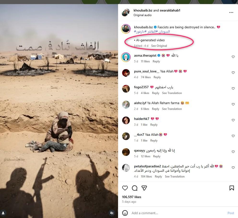 Siaran itu, yang diterbitkan pada 29 Oktober 2025 dan mendapat lebih 109,000 tanda suka, disertakan dengan kapsyen secara jelas menyatakan bahawa ia dijana menggunakan AI dan mengandungi tiga tanda pagar: "#Sudan #ElFasher #Darfur".