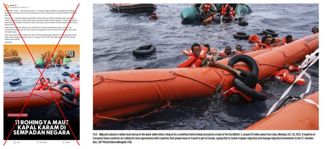 Sekurang-kurangnya 32 orang maut selepas bot yang membawa pendatang asing tanpa izin dilaporkan karam di perairan sempadan Malaysia-Thailand pada November 2025. Ketika seramai 14 orang terselamat, siaran media sosial yang memberi maklumat terkini tentang insiden itu berkongsi foto lama yang sebenarnya menunjukkan pendatang asing diselamatkan di Laut Mediterranean pada 2021.