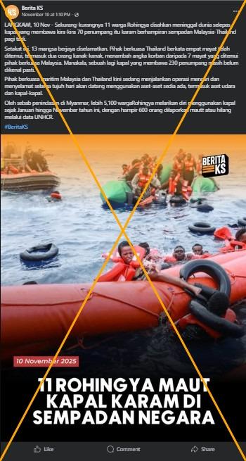 "Sekurang-kurangnya 11 warga Rohingya disahkan meninggal dunia selepas kapal yang membawa kira-kira 70 penumpang itu karam berhampiran sempadan Malaysia-Thailand pagi tadi," bunyi sebahagian kapsyen Facebook dikongsi pada 10 November 2025.