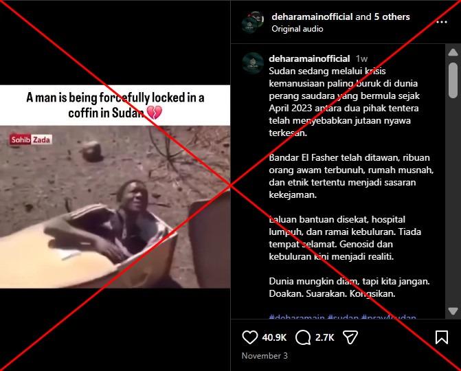 Selepas pasukan separa tentera Pasukan Sokongan Pantas (RSF) di Sudan menawan kubu kuat tentera di bandar barat El-Fasher pada akhir Oktober 2025, siaran media sosial berkongsi satu video yang kononnya menunjukkan seorang lelaki dipaksa ke dalam keranda di Sudan. Video itu sebenarnya dirakam pada 2016 dan menunjukkan petani kulit putih di Afrika Selatan menolak seorang lelaki kulit hitam ke dalam keranda.