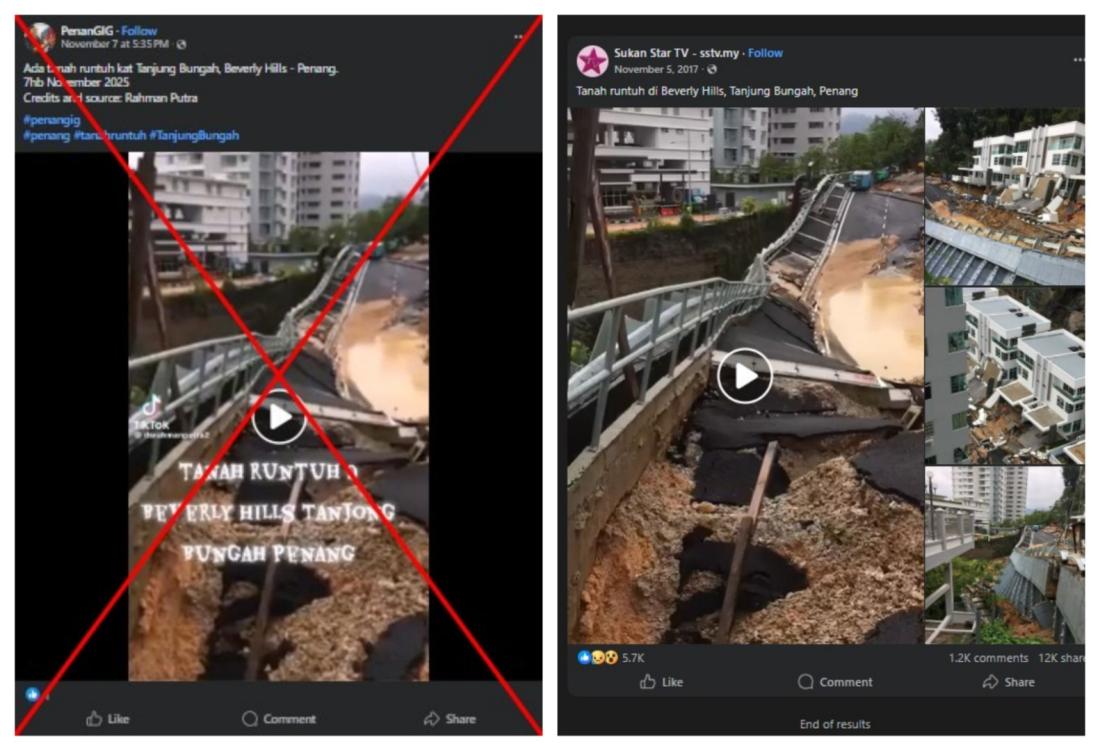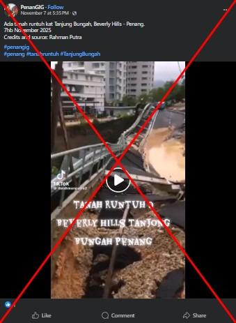 "Ada tanah runtuh kat Tanjung Bungah, Beverly Hills - Penang. 7hb November 2025," bunyi siaran Facebook pada 7 November 2025. Teks yang tertera dalam video itu turut membuat dakwaan yang sama.