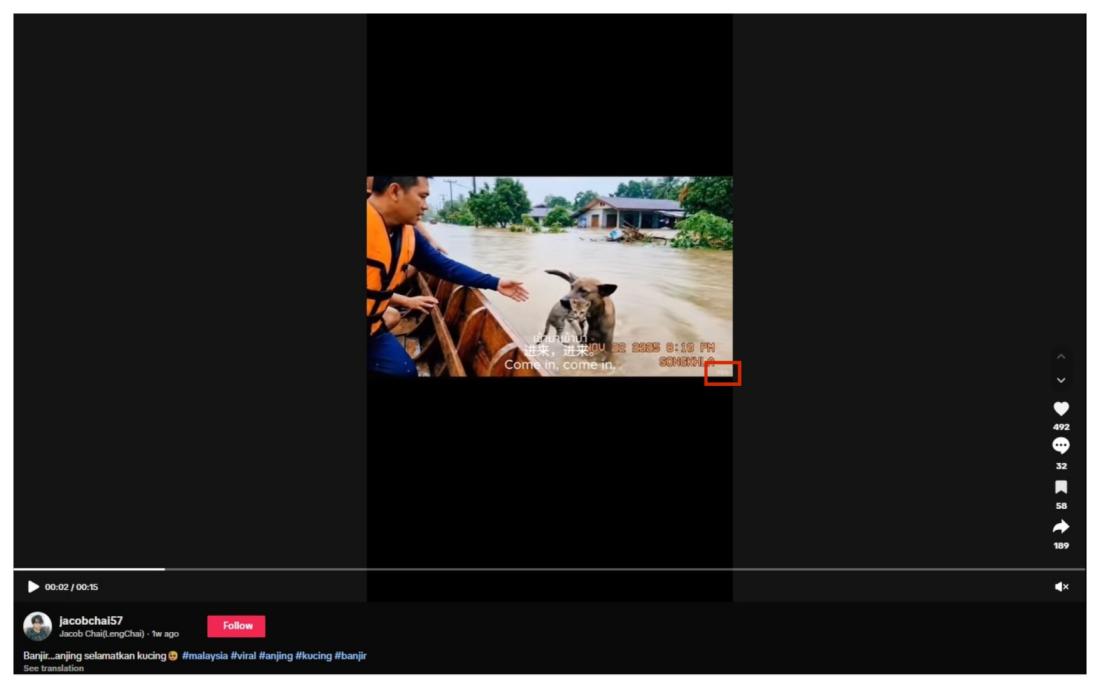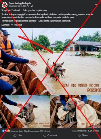 "Seekor anjing menggigit kemas anak kucing kecil di dalam mulutnya dan menggunakan seluruh tenaganya untuk berlari menuju bot penyelamat bagi meminta pertolongan!," bunyi sebahagian siaran Facebook pada 23 November 2025.