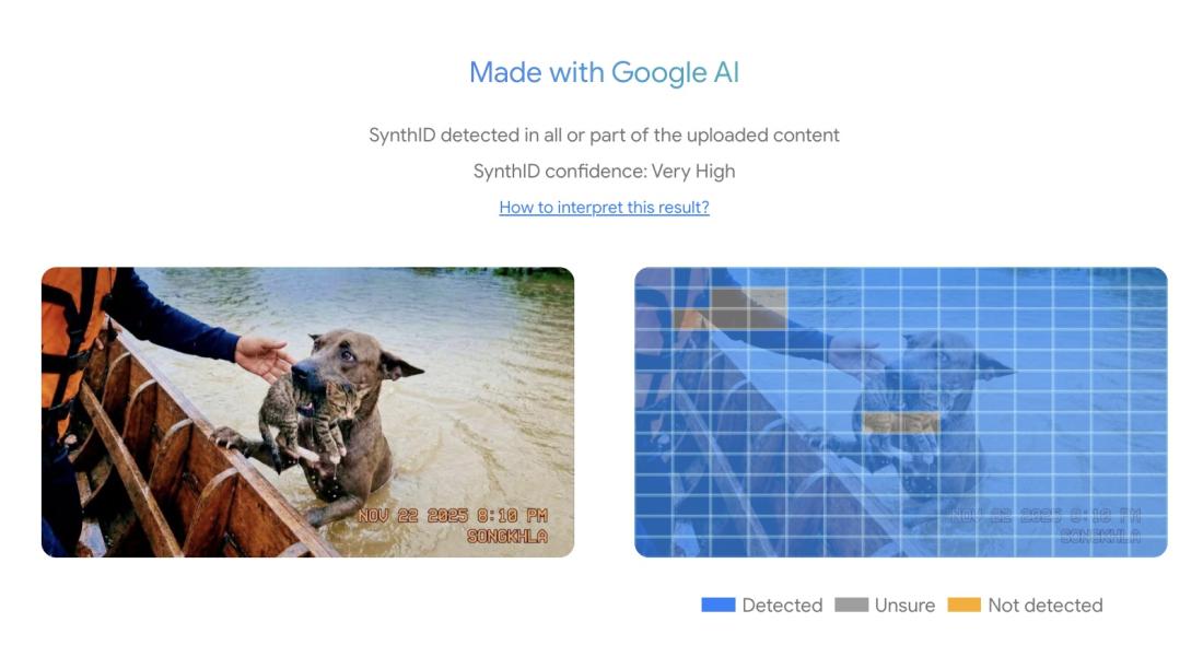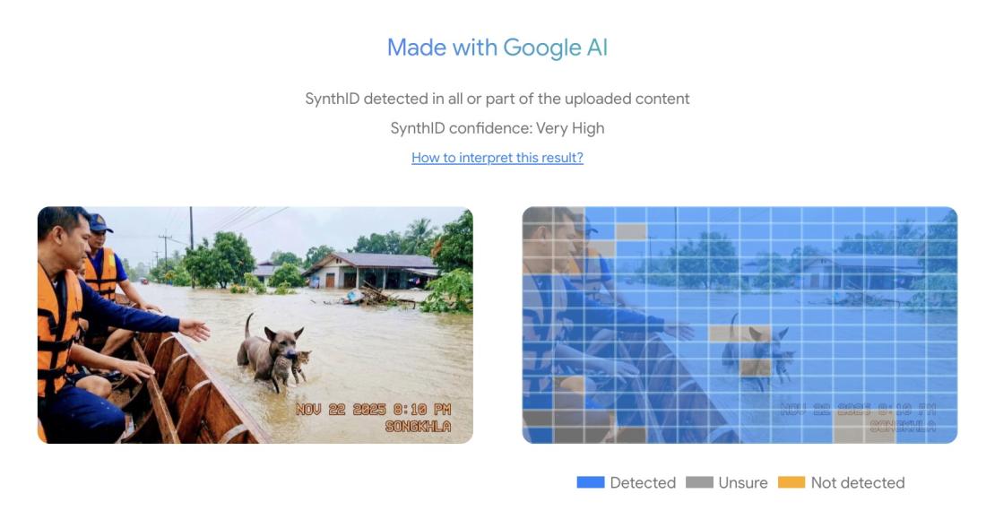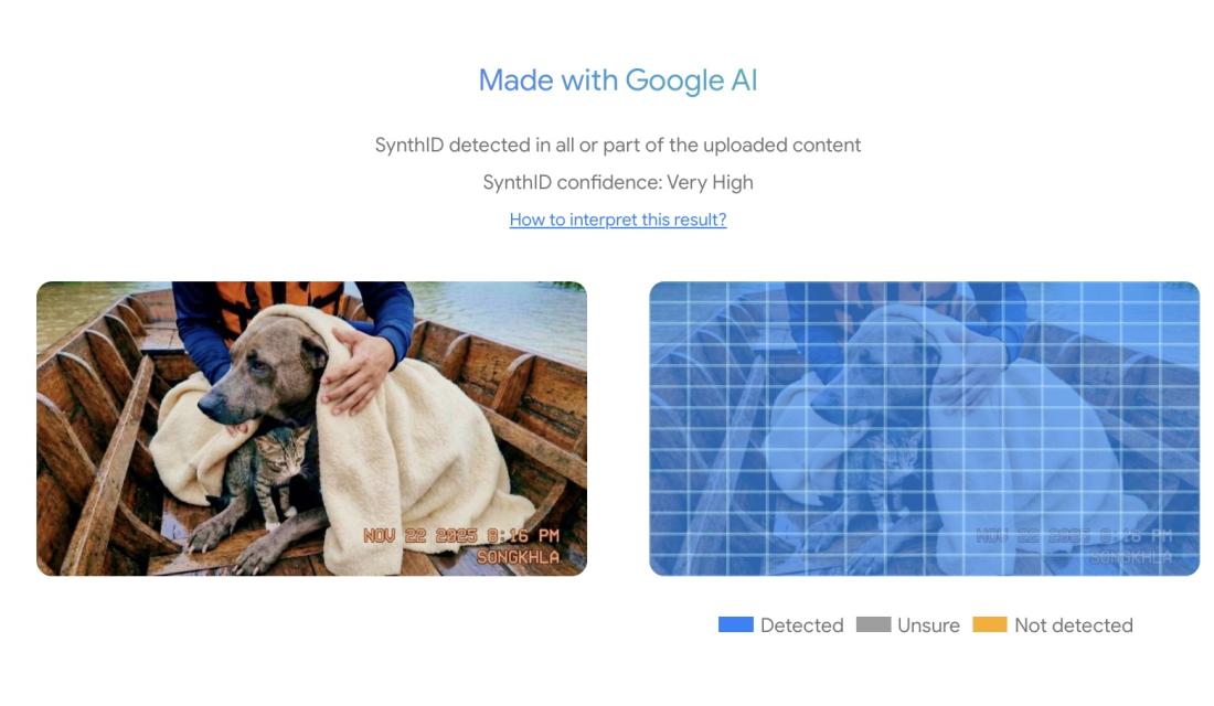 Google SynthID Detector -- alat yang dilancarkan pada Mei 2025 untuk mengenal pasti kandungan yang dijana AI -- mengesan tanda air digital yang menunjukkan ia dicipta menggunakan model generatif Google (pautan arkib).