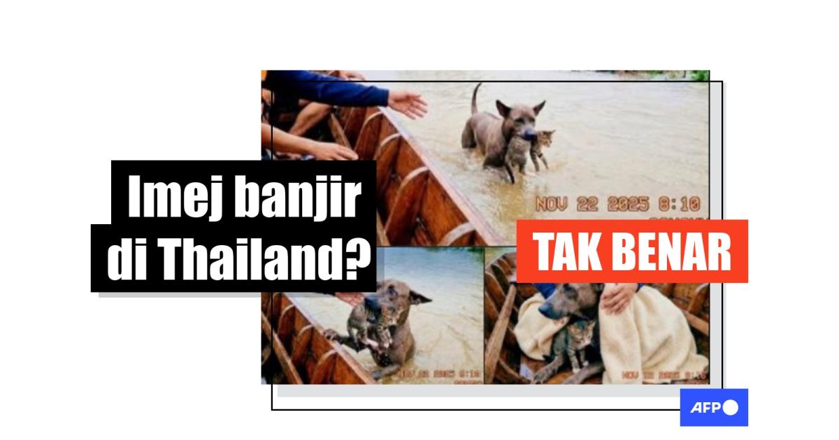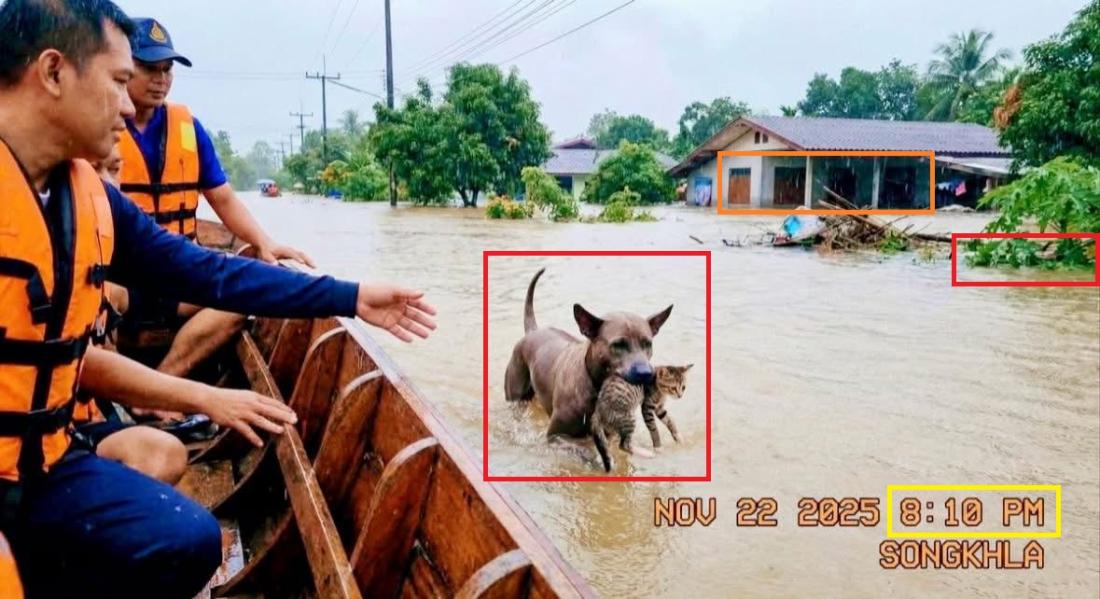 Selatan Thailand dilanda banjir selepas hujan lebat berterusan pada akhir November, tetapi imej seekor anjing yang kononnya membawa anak kucing kepada penyelamat di dalam bot sebenarnya dijana menggunakan kecerdasan buatan (AI). Gambar-gambar tersebut pada asalnya disiarkan dengan penafian bahawa ia bukan imej benar, dan alat pengesan Google mendapati ia dihasilkan menggunakan AI.