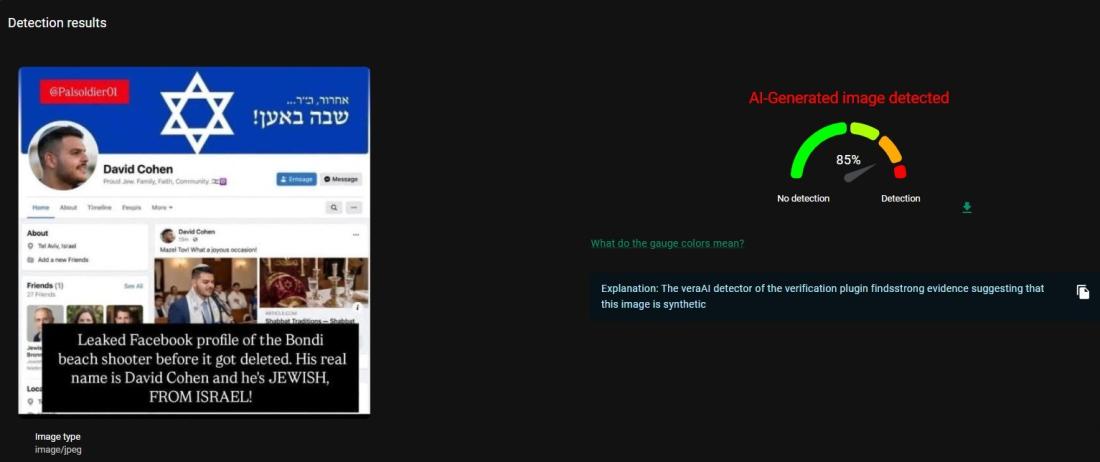 Selepas insiden tembakan beramai-ramai di Pantai Bondi terkenal di Sydney semasa satu acara keagamaan sempena perayaan Hanukkah, pengguna media sosial secara palsu mendakwa serangan itu dilakukan oleh "orang mereka sendiri". Mereka mendakwa salah seorang penembak adalah seorang lelaki warga Israel bernama "David Cohen", tetapi imej yang kononnya diambil daripada profil Facebooknya mengandungi kesilapan yang menunjukkan ia dijana oleh AI. Media Australia telah mengenal pasti suspek dalam insiden itu sebagai Sajid Akram dan anaknya Naveed.