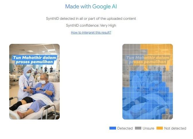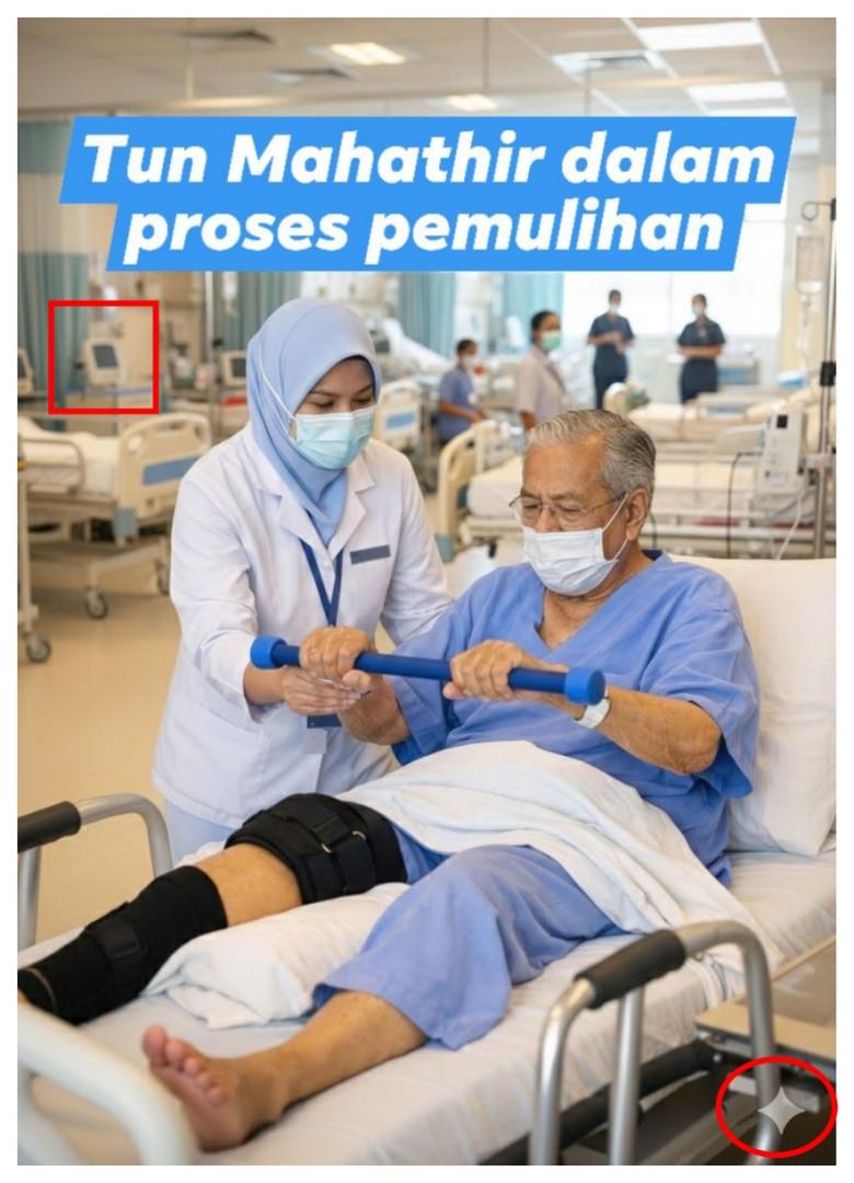 Selepas bekas perdana menteri Mahathir Mohamad dimasukkan ke hospital akibat terjatuh di rumahnya pada 6 Januari 2026, beberapa imej yang kononnya menunjukkan beliau menjalani fisioterapi mula beredar di media sosial. Pegawai media beliau memberitahu AFP bahawa tiada foto daripada rawatan beliau di hospital telah dikeluarkan, dan alat pengesan, termasuk SynthID milik Google, menunjukkan imej berkenaan dijana menggunakan kecerdasan buatan (AI).