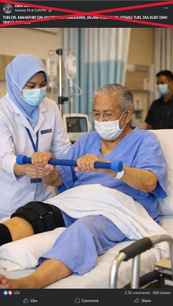 "TUN DR. MAHATHIR DALAM PROSES PEMULIHAN, JALANI FISIO DI IJN. KENALI TUN, DIA KUAT DAN TINGGI DISIPLIN," bunyi siaran Facebook pada 14 Januari.