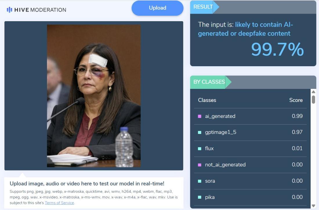 Alat pengesan AI Hive Moderation menganggarkan 99.7% kebarangkalian bahawa imej itu "mengandungi kandungan dijana AI atau deepfake".