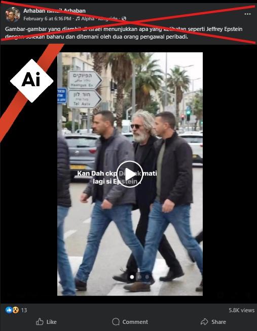 "Gambar-gambar yang diambil di Israel menunjukkan apa yang kelihatan seperti Jeffrey Epstein dengan solekan baharu dan ditemani oleh dua orang pengawal peribadi," bunyi siaran Facebook pada 6 Februari 2026.