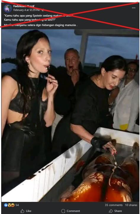 "Kamu tahu apa yang Epstein sedang makan di sini?? Kamu tahu apa yang terbaring di sini?? Mereka menjamu selera dgn hidangan daging manusia," bunyi siaran Facebook pada 4 Februari 2026.