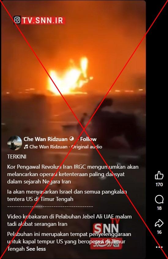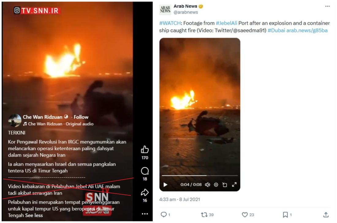 Pelabuhan besar Jebel Ali di Dubai terbakar ketika Iran melancarkan peluru berpandu dan dron merentasi negara-negara Teluk, sebagai tindakan balas terhadap serangan AS-Israel ke atas republik Islam itu. Tetapi rakaman yang beredar dalam talian yang kononnya menggambarkan kebakaran itu sebenarnya berlaku pada 2021, apabila sebuah kapal kontena terbakar di pelabuhan sama.