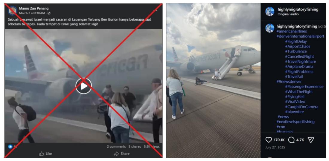 Iran melepaskan puluhan peluru berpandu ke arah Israel dan beberapa negara Teluk selepas satu serangan bersama Amerika Syarikat-Israel membunuh pemimpin tertingginya, Ayatollah Ali Khamenei, pada akhir Februari 2026. Namun, video menunjukkan evakuasi penumpang dari sebuah pesawat bukan dirakam di sebuah lapangan terbang Israel selepas serangan Iran. Ia sebenarnya dirakam pada Julai 2025 semasa sebuah pesawat American Airlines terbakar ketika berlepas di Colorado, AS.