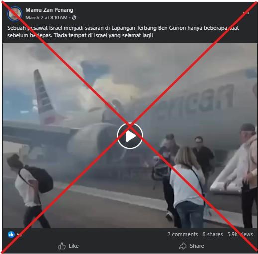 "Sebuah pesawat Israel menjadi sasaran di Lapangan Terbang Ben Gurion hanya beberapa saat sebelum berlepas. Tiada tempat di Israel yang selamat lagi!" bunyi siaran Facebook dikongsi pada 2 Mac 2026.