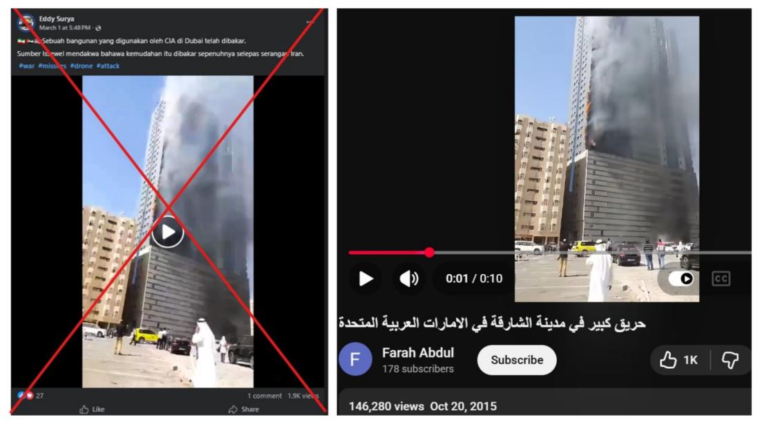 Iran melancarkan serangan balas terhadap negara Teluk selepas serangan bersama Israel-Amerika Syarikat yang bermula pada 28 Februari, 2026, tetapi rakaman video yang tular di media sosial tidak menujukkan "ibu pejabat CIA di Dubai" dibedil peluru berpandu Iran. Video tersebut sebenarnya pernah beredar pada Oktober 2015 dan menunjukkan kebakaran sebuah bangunan di Sharjah, bandar pelabuhan utama di Emiriah Arab Bersatu (UAE).