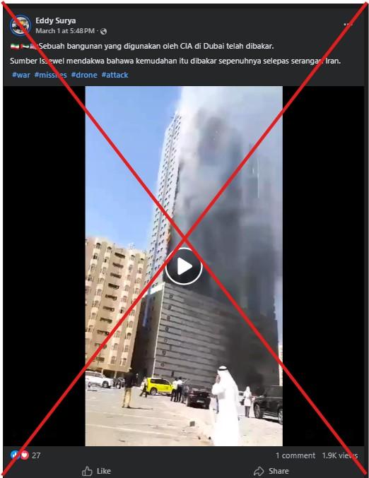 "Sebuah bangunan yang digunakan oleh CIA di Dubai telah dibakar," bunyi sebahagian siaran Facebook dikongsi pada 1 Mac 2026.
