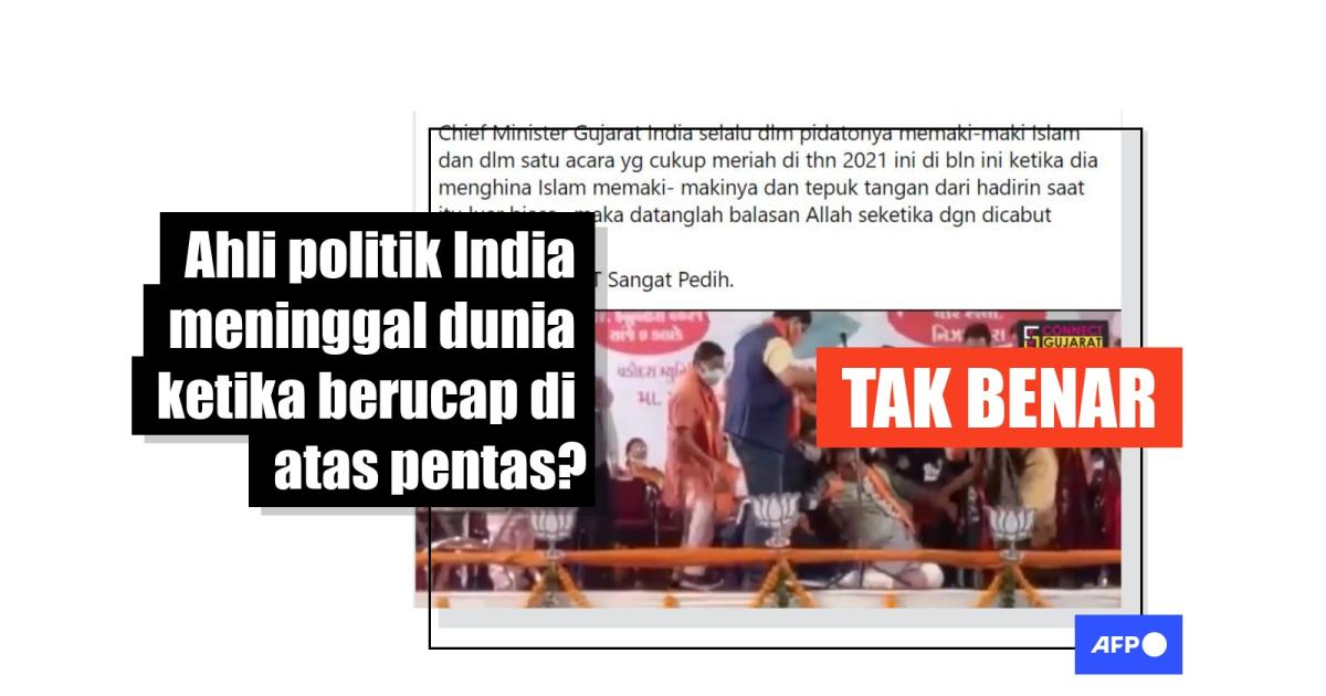 Video seorang ahli politik India rebah semasa memberi ucapannya di satu perhimpunan telah ditonton ribuan kali di Facebook bersama-sama dakwaan bahawa beliau meninggal dunia di atas pentas. Dakwaan itu tidak benar; video itu menunjukkan Vijay Rupani, ketua menteri negeri Gujarat di India pada masa itu, pengsan semasa memberi ucapannya pada Februari 2021 tetapi beliau masih hidup.