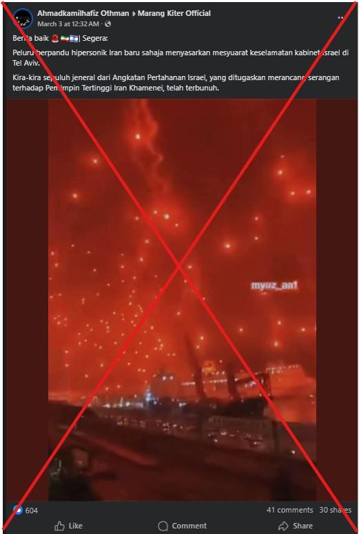 "Peluru berpandu hipersonik Iran baru sahaja menyasarkan mesyuarat keselamatan kabinet Israel di Tel Aviv," bunyi sebahagian siaran Facebook dikongsi pada 3 Mac 2026.