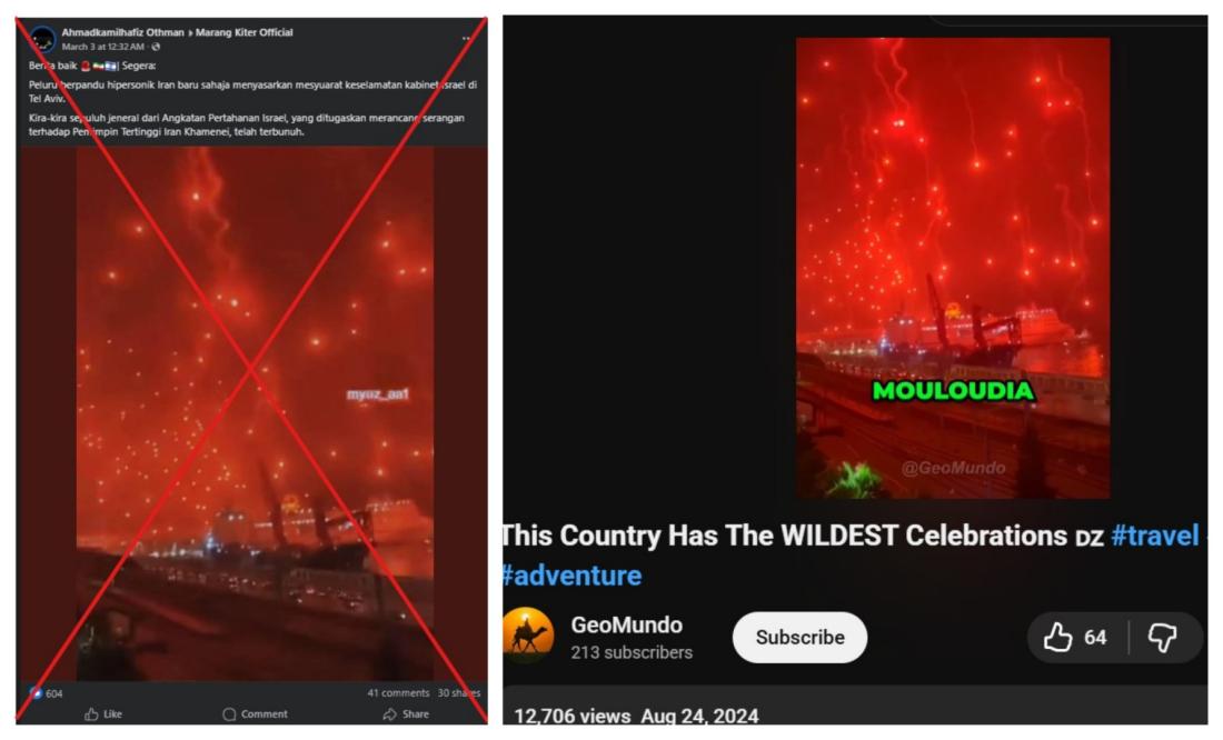 Iran melancarkan peluru berpandu dan dron sebagai tindakan balas terhadap Israel selepas serangan udara Amerika Syarikat-Israel membunuh pemimpin tertingginya, Ayatollah Ali Khamenei. Namun, video yang menunjukkan suar merah menjunam dari langit tidak berkaitan dengan perang tersebut. Rakaman itu -- yang berulang kali disalah tafsir -- sebenarnya dirakam di Algeria ketika bunga api dinyalakan sempena sambutan peminat bola sepak pada 2024.