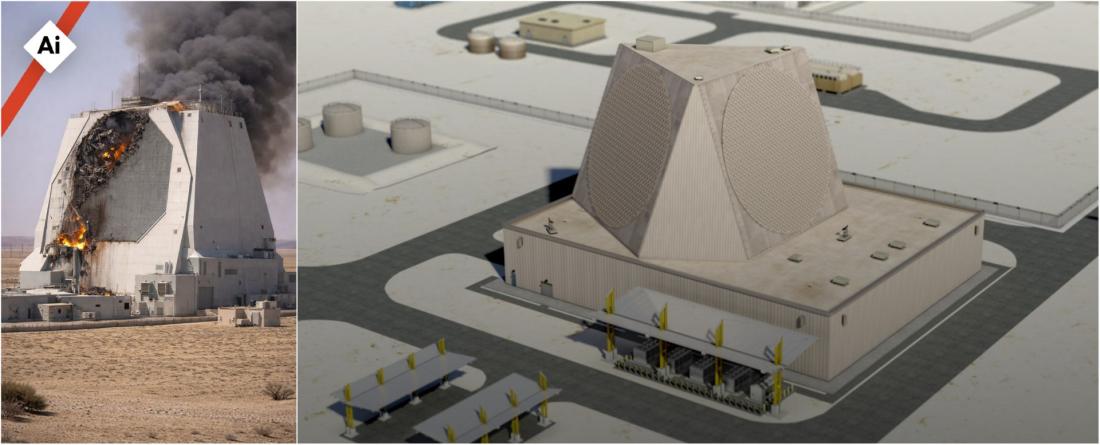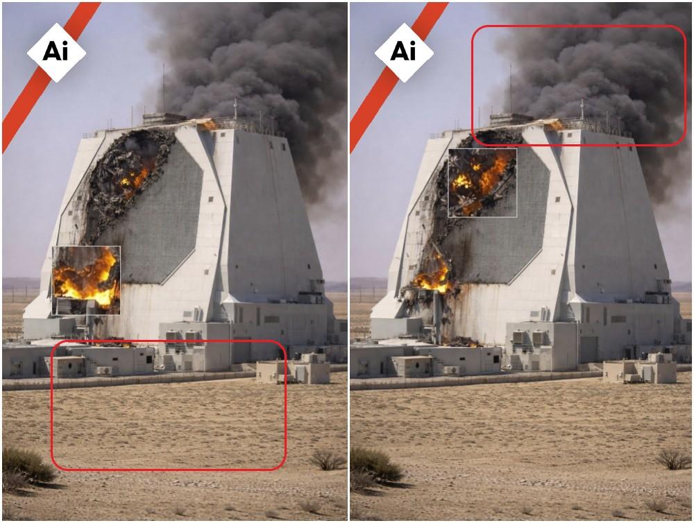 Pemeriksaan lanjut terhadap ilustrasi yang dikeluarkan Tentera Udara Amerika Syarikat menunjukkan percanggahan antara radar AN/FPS-132 sebenar dan imej AI yang tular itu (pautan arkib).