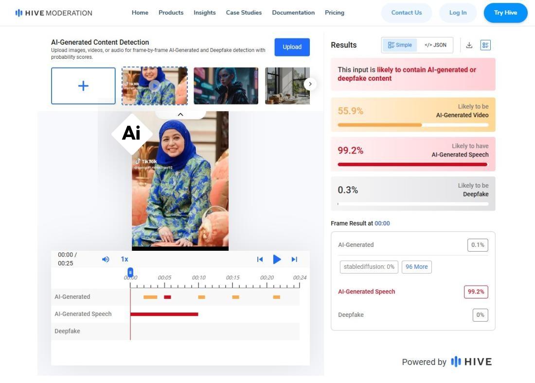 Analisis video dikongsi secara salah itu oleh pengesan video Hive Moderation AI mendapati ia "kemungkinan mengandungi kandungan yang dijana AI atau deepfake" (pautan arkib).