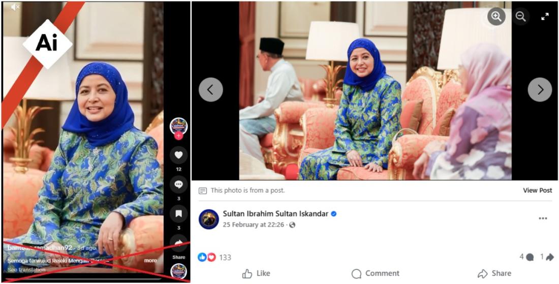 Carian imej terbalik dan carian kata kunci seterusnya di Google mendapati ia telah diubah menggunakan gambar Raja Permaisuri Agong yang dimuat naik ke halaman Facebook rasmi Yang di-Pertuan Agong Sultan Ibrahim pada 25 Februari (pautan arkib).