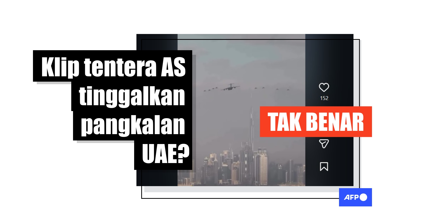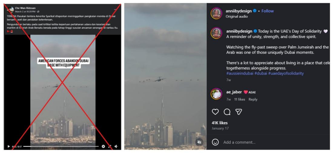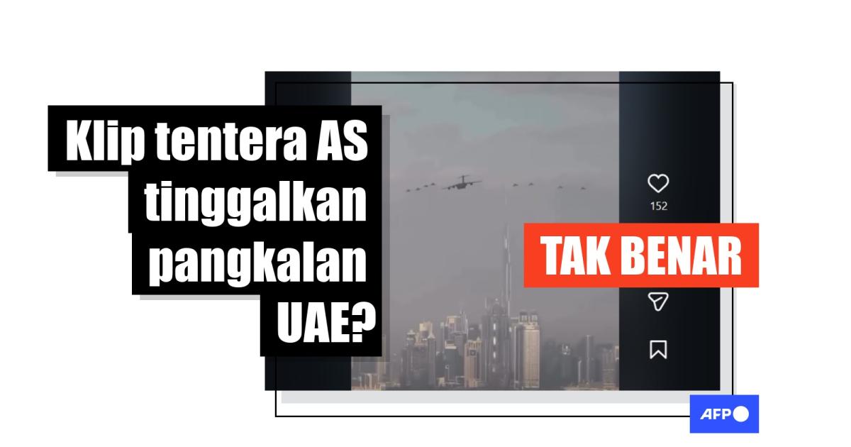 Selepas Iran menyerang beberapa negara Teluk yang menempatkan kepentingan Amerika sebagai tindak balas terhadap serangan bersama AS-Israel yang menyasarkan republik Islam itu pada 28 Februari 2026, pengguna media sosial berkongsi satu video yang kononnya menunjukkan tentera AS meninggalkan pangkalan di Emiriah Arab Bersatu (UAE). Pengguna Instagram yang merakam klip asal itu memberitahu AFP ia sebenarnya dirakam semasa pertunjukan udara sempena Hari Solidariti UAE pada 17 Januari, sebelum perang tercetus.