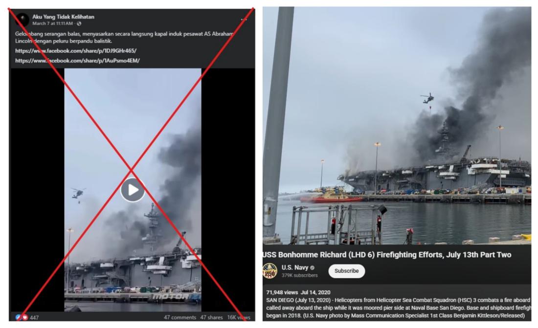 Iran mendakwa telah menyerang sebuah kapal pengangkut pesawat milik Amerika Syarikat menggunakan dron ketika membalas serangan bersama AS–Israel pada akhir Februari, yang mencetuskan konflik serantau. Namun, dua video tular di media sosial tidak menunjukkan sebarang kerosakan pada USS Abraham Lincoln dan Amerika Syarikat menegaskan kapal itu tidak terkena serangan dron Iran. Salah satu video didapati dijana menggunakan AI, manakala satu lagi melibatkan kebakaran sebuah kapal perang AS pada 2020.