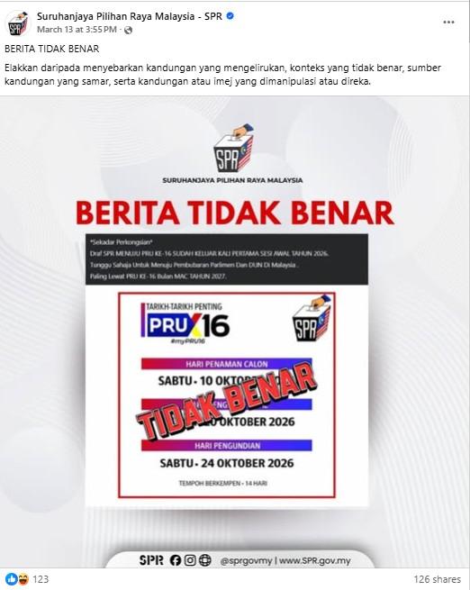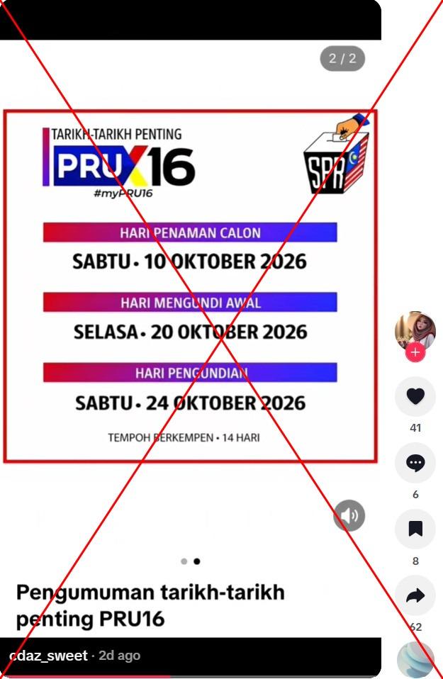 "TARIKH-TARIKH PENTING PRU16," tulis sebahagian teks pada siaran TikTok dikongsi pada 16 Mac 2026.