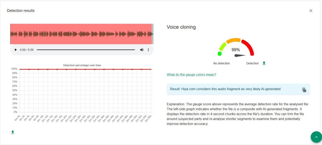 Analisis menggunakan alat Hiya dalam plugin pengesahan InVID‑WeVerify menunjukkan terdapat 99 peratus kebarangkalian audio tersebut dijana oleh AI.