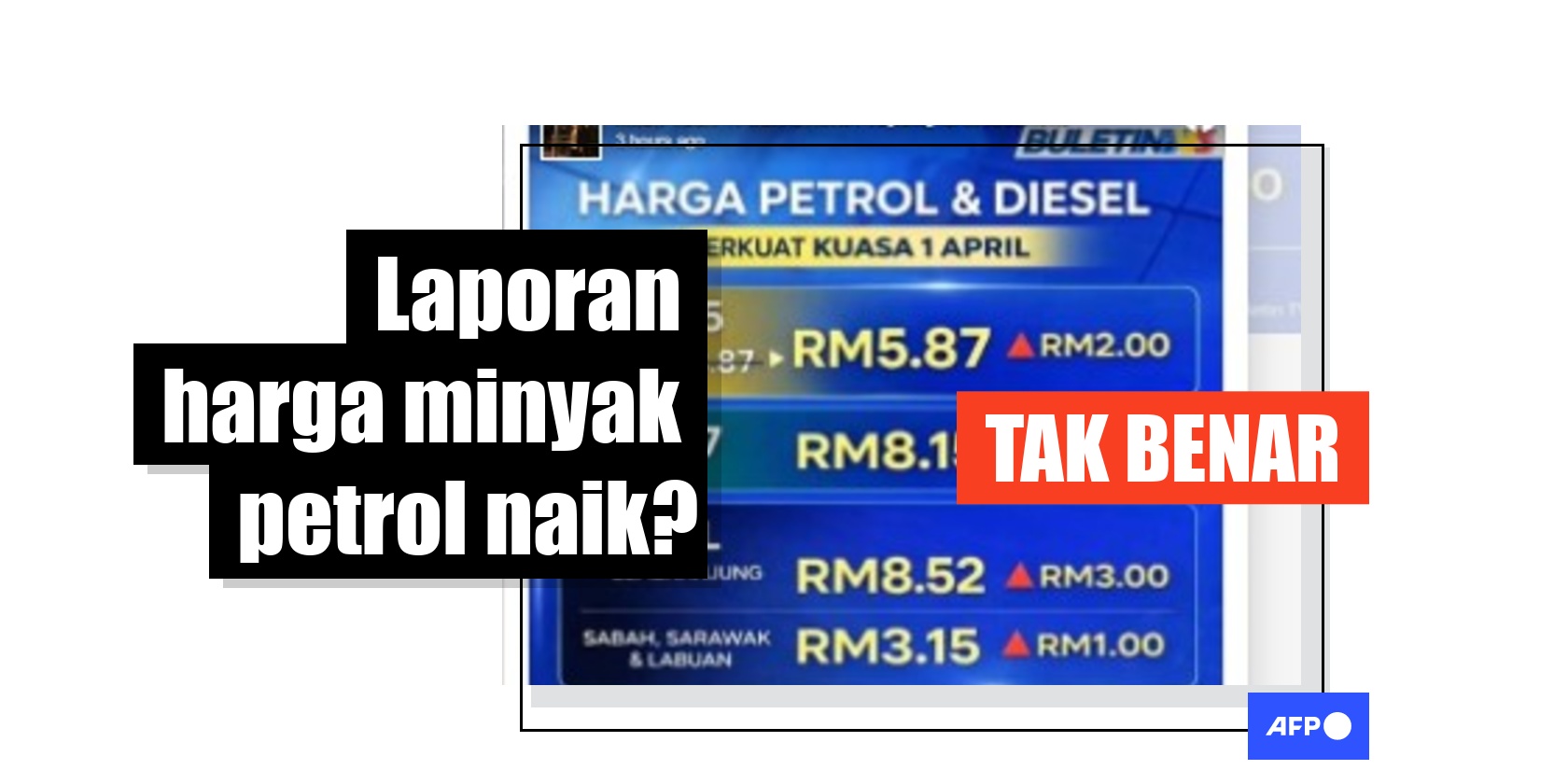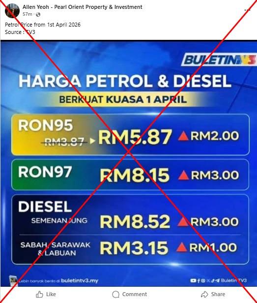 Kenaikan harga bahan api yang tercetus akibat konflik Asia Barat menyebabkan orang ramai bimbang tentang ketidaktentuan harga petrol, tetapi siaran media sosial yang mendakwa harga petrol akan meningkat secara mendadak sebenarnya berkongsi grafik hasil suntingan. Syarikat penyiaran televisyen TV3 dan Kementerian Kewangan menafikan mengeluarkan grafik tular memaparkan harga petrol dan diesel yang tidak tepat.