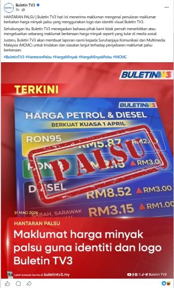 "Harga petrol dari 1 April 2026. Sumber: TV3," bunyi kapsyen bahasa Inggeris pada siaran Facebook dikongsi pada 31 Mac 2026.