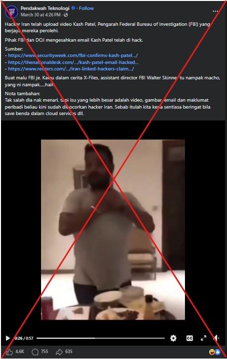 "Hacker Iran telah upload video Kash Patel, Pengarah Federal Bureau of Investigation (FBI) yang berjaya mereka perolehi," bunyi siaran Facebook pada 30 Mac 2026.