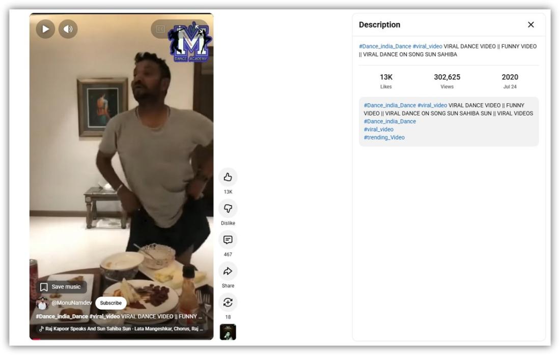 Carian imej terbalik menunjukkan bahawa klip tersebut telah beredar dalam talian sejak sekurang‑kurangnya Julai 2020, dengan salah satu hantaran YouTube terawal menyatakan bahawa lelaki itu menari mengikut lagu 'Sun Sahiba Sun' nyanyian mendiang Lata Mangeshkar dari filem Bollywood 1985 'Ram Teri Ganga Maili' (pautan arkib di sini, di sini, di sini dan di sini).