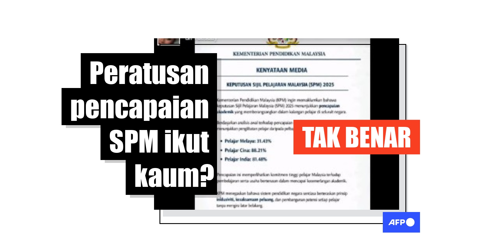 Calon peperiksaan Sijil Pelajaran Malaysia (SPM) 2025 menerima keputusan pada 31 Mac 2026, tetapi kenyataan yang kononnya dikeluarkan Kementerian Pendidikan (KPM) yang memaparkan pecahan pencapaian mengikut kaum adalah rekaan. KPM menafikan mengeluarkan dokumen tersebut, yang mengandungi ralat pada format dan ejaan. Lembaga Peperiksaan lazimnya menyediakan analisis keputusan tahunan yang menunjukkan perbezaan pencapaian antara pelajar bandar dan luar bandar, tetapi bukan mengikut kaum.