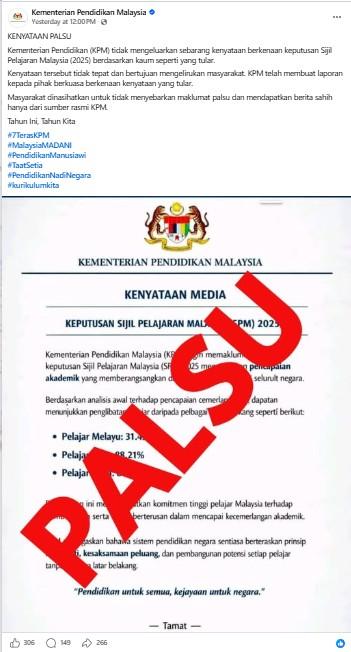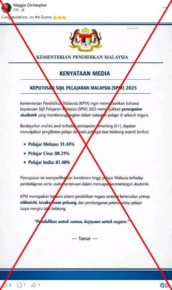 "Kementerian Pendidikan (KPM) tidak mengeluarkan sebarang kenyataan berkenaan keputusan Sijil Pelajaran Malaysia (2025) berdasarkan kaum seperti yang tular," katanya.