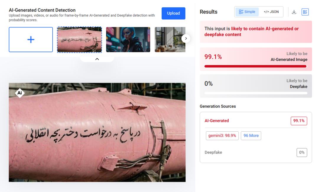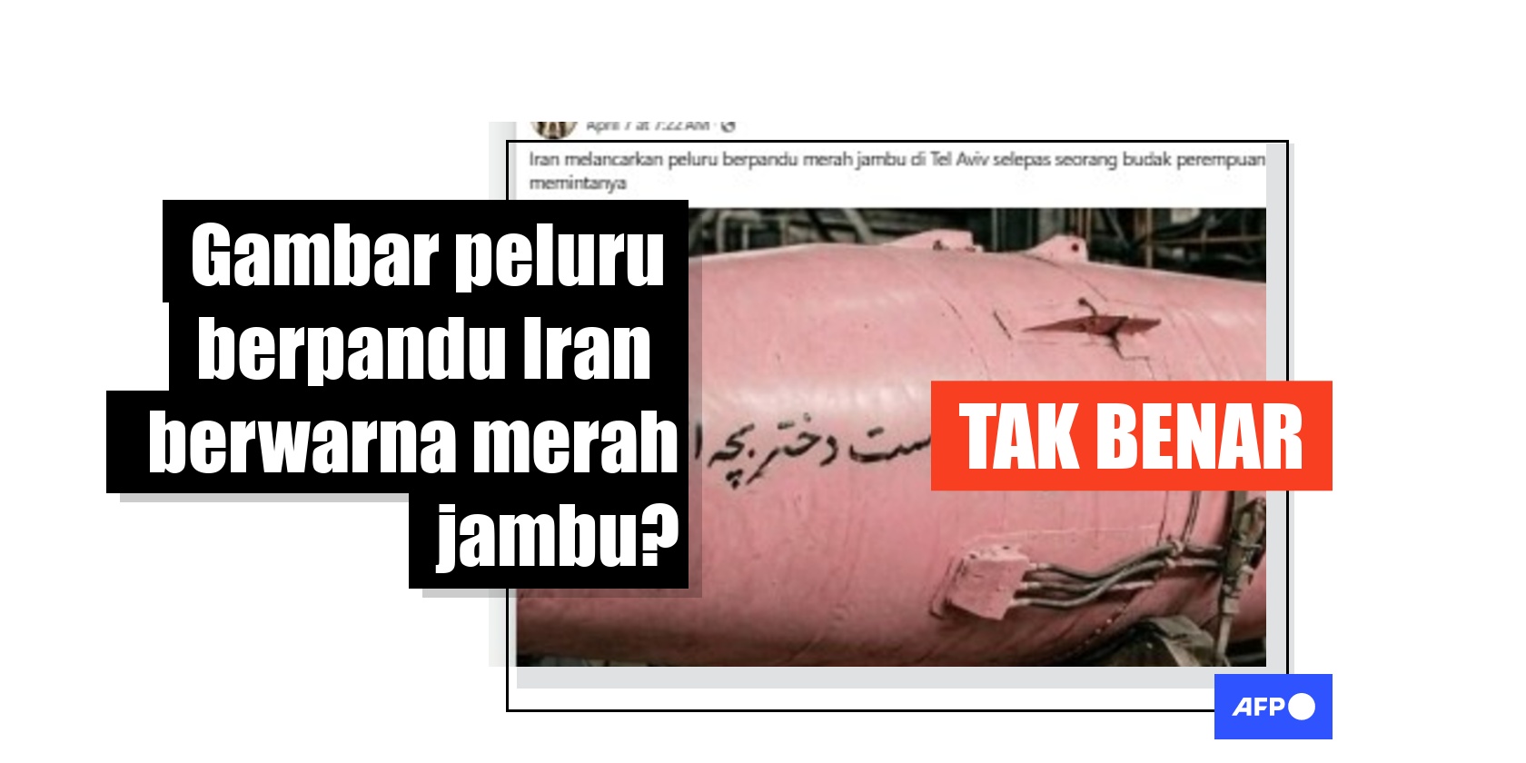 Ketika gencatan senjata selama dua minggu dilanjutkan susulan ketegangan konflik di Asia Barat dan Amerika Syarikat (AS) melaksanakan sekatan di Selat Hormuz, imej peluru berpandu merah jambu yang dijana dengan kecerdasan buatan (AI) muncul di media sosial dengan dakwaan ia dibuat atas permintaan seorang gadis Iran yang meminta ia ditembak ke Israel. Struktur peluru berpandu itu tidak mengikut bentuk logik, penganalisis konflik memberitahu AFP.