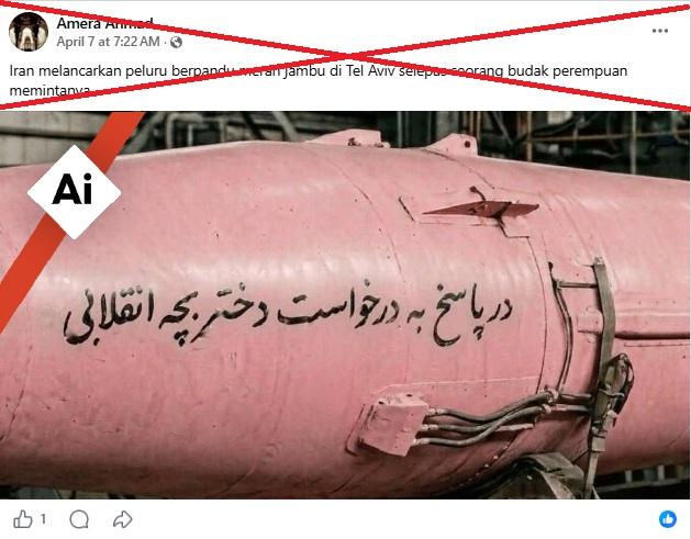 "Iran melancarkan peluru berpandu merah jambu di Tel Aviv selepas seorang budak perempuan memintanya," bunyi kapsyen imej pada siaran Facebook dikongsi pada 7 April 2026.